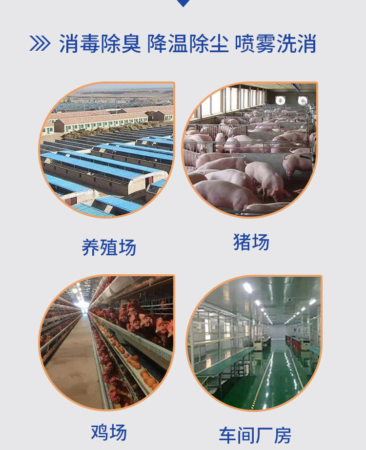 ?微小顆粒:通過高壓力將水或消毒液霧化成微小顆粒,通常在10微米到50微米的范圍內(nèi);? 均勻分布:能夠產(chǎn)生均勻細密的霧化效果,使微小顆粒均勻分布在空氣中或目標(biāo)表面上。這種均勻分布可以確保消毒液充分接觸到目標(biāo)區(qū)域的每一個角落,提高消毒效果;? 高效節(jié)水:高壓微霧產(chǎn)品能夠?qū)⒁后w轉(zhuǎn)化為更多的微小顆粒,從而實