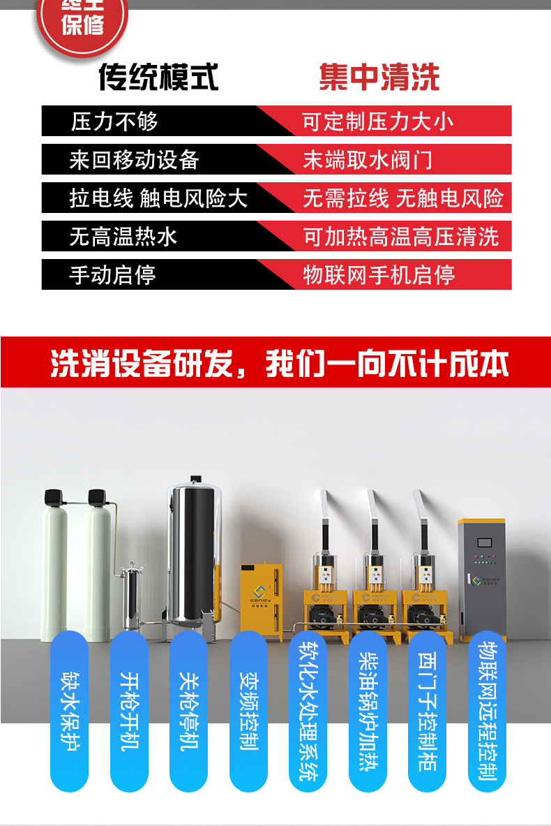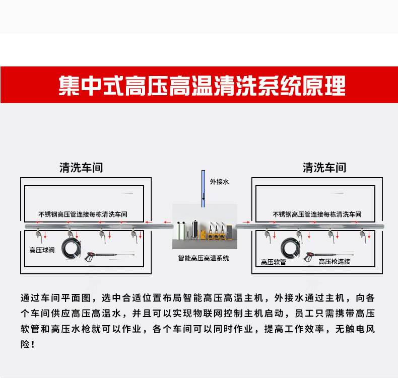 通過場所平面圖,選中合適位置布局智能高壓高溫主機,外接水通過主機,向各個場所供應高壓高溫水,并且可以實現(xiàn)物聯(lián)網(wǎng)控制主機啟動,員工只需攜帶高壓軟管和高壓水槍就可以作業(yè),各個場所可以同時作業(yè),提高工作效率,無觸電風險!
